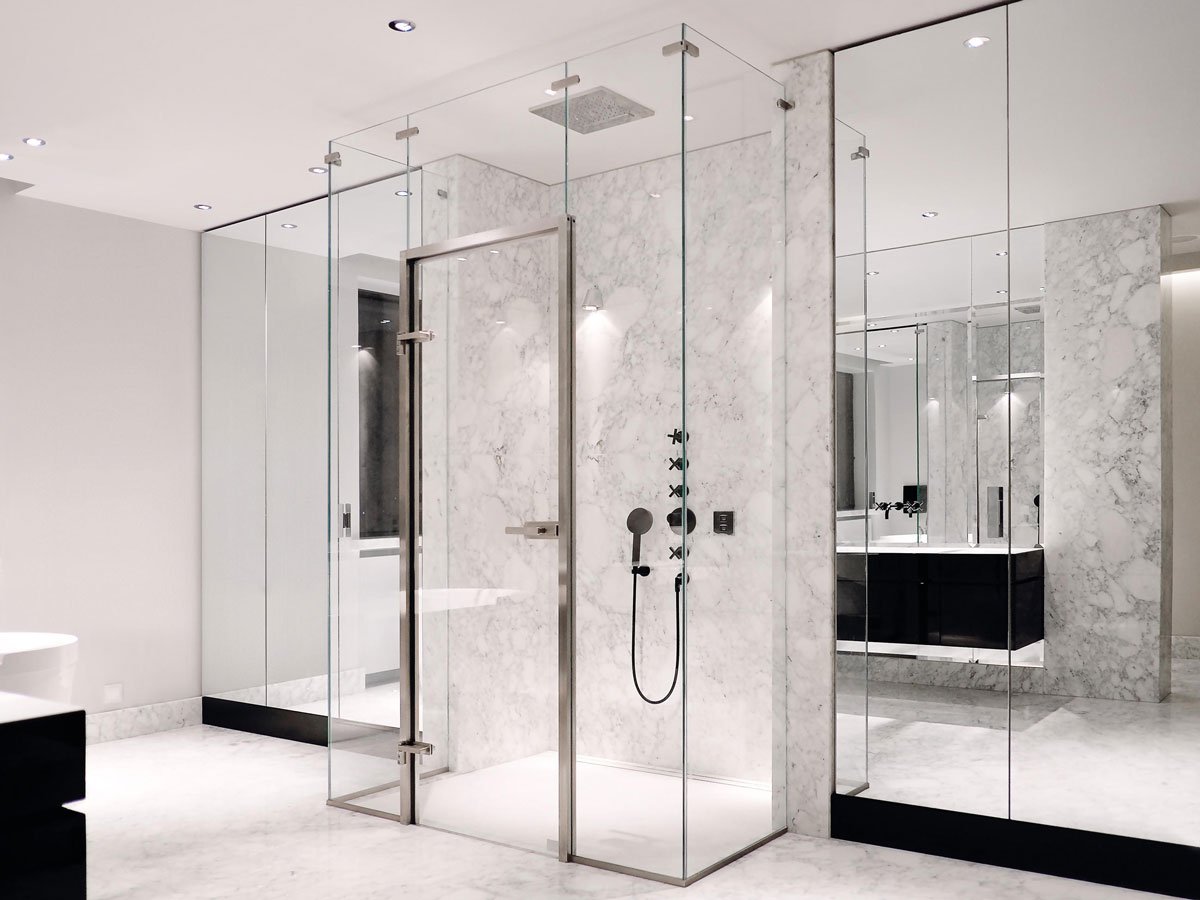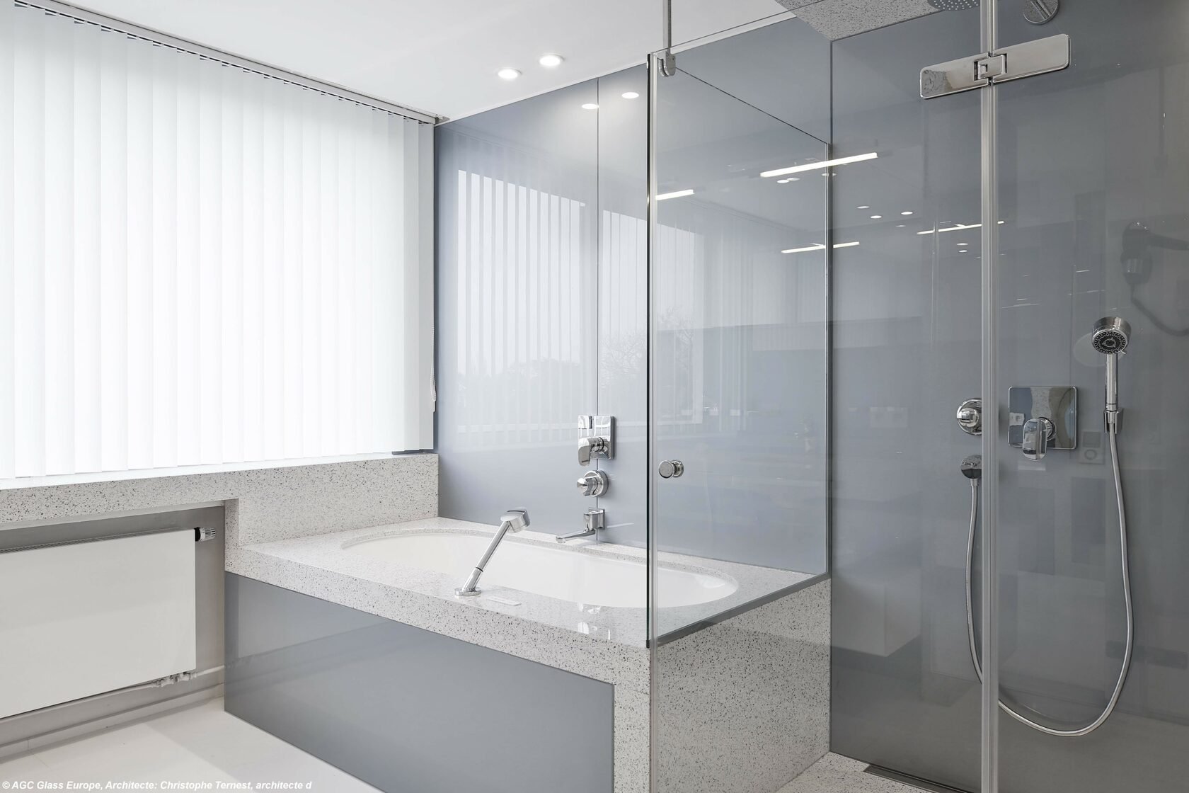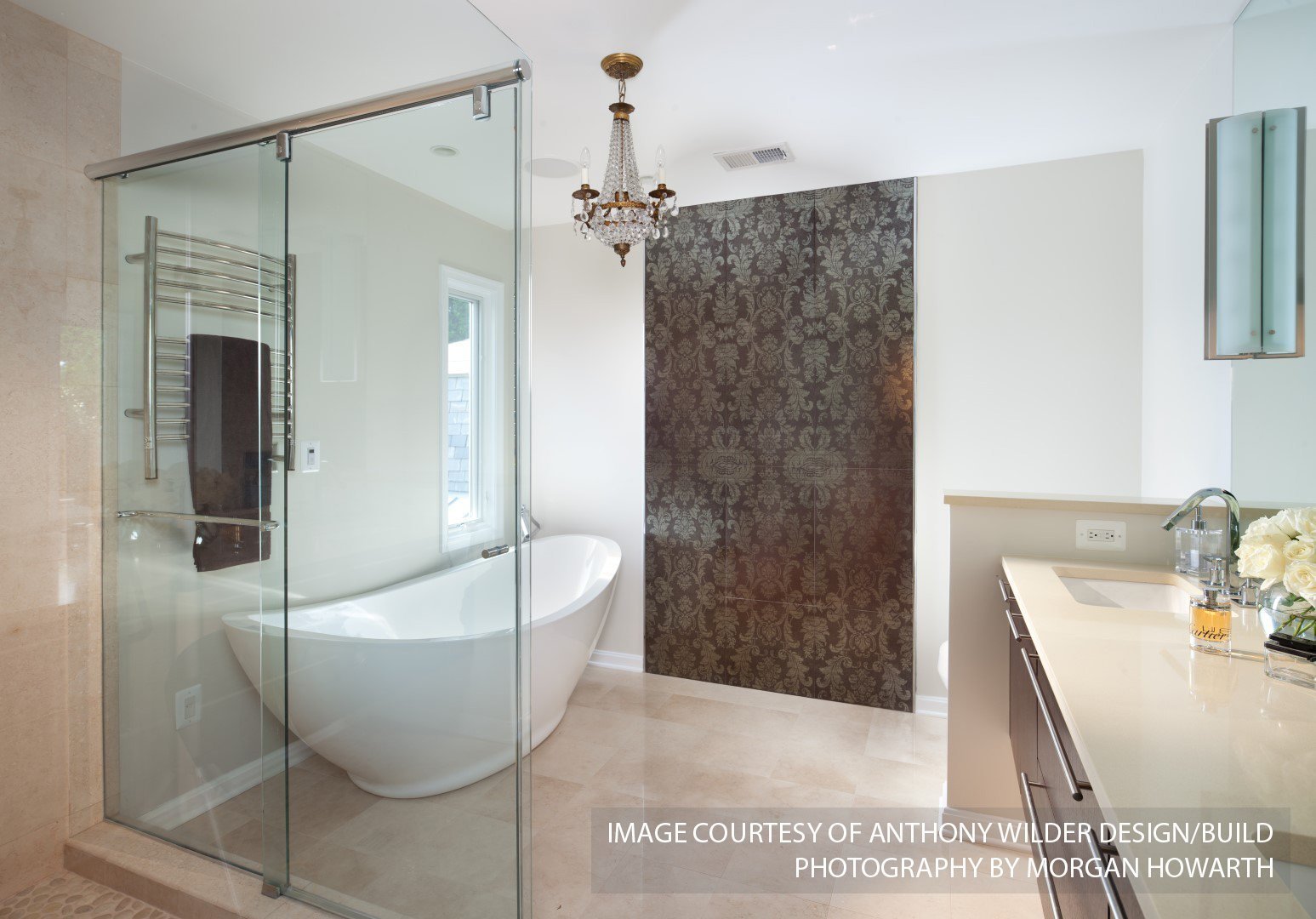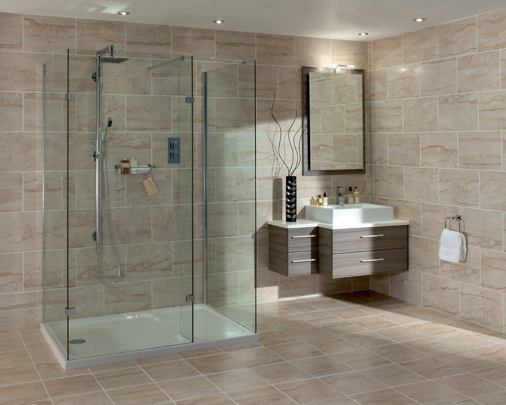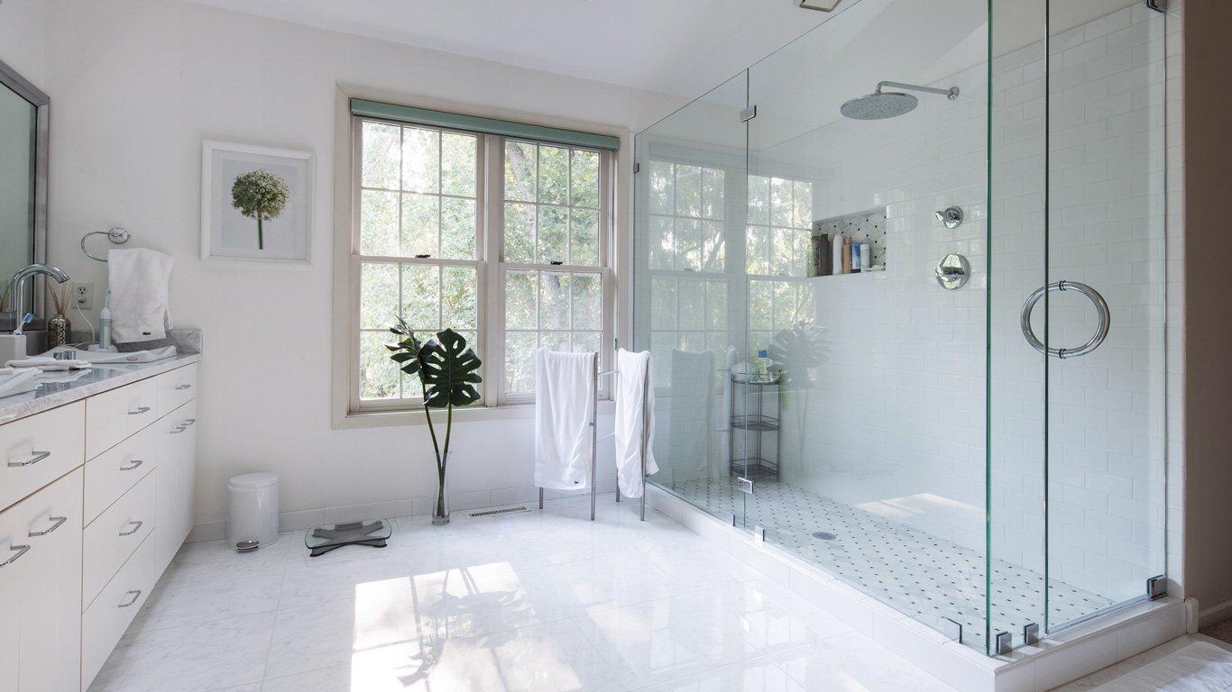 Интерьер ванной комнаты с душевой кабиной и ванной